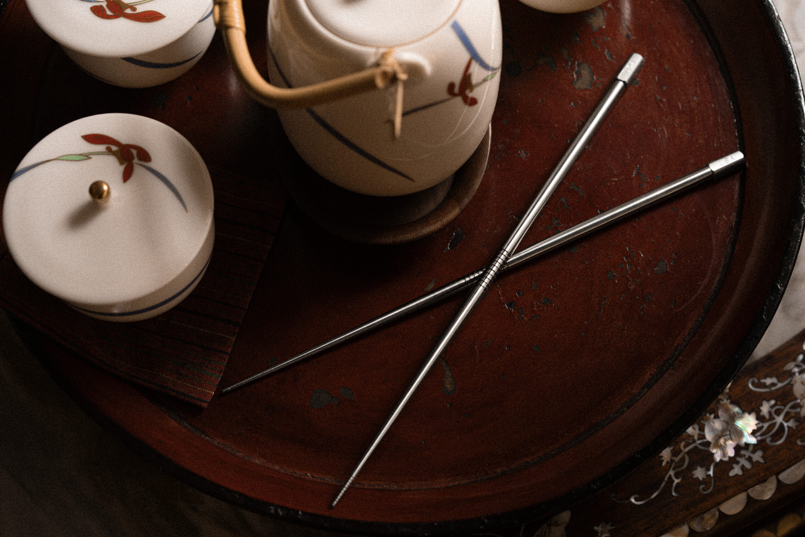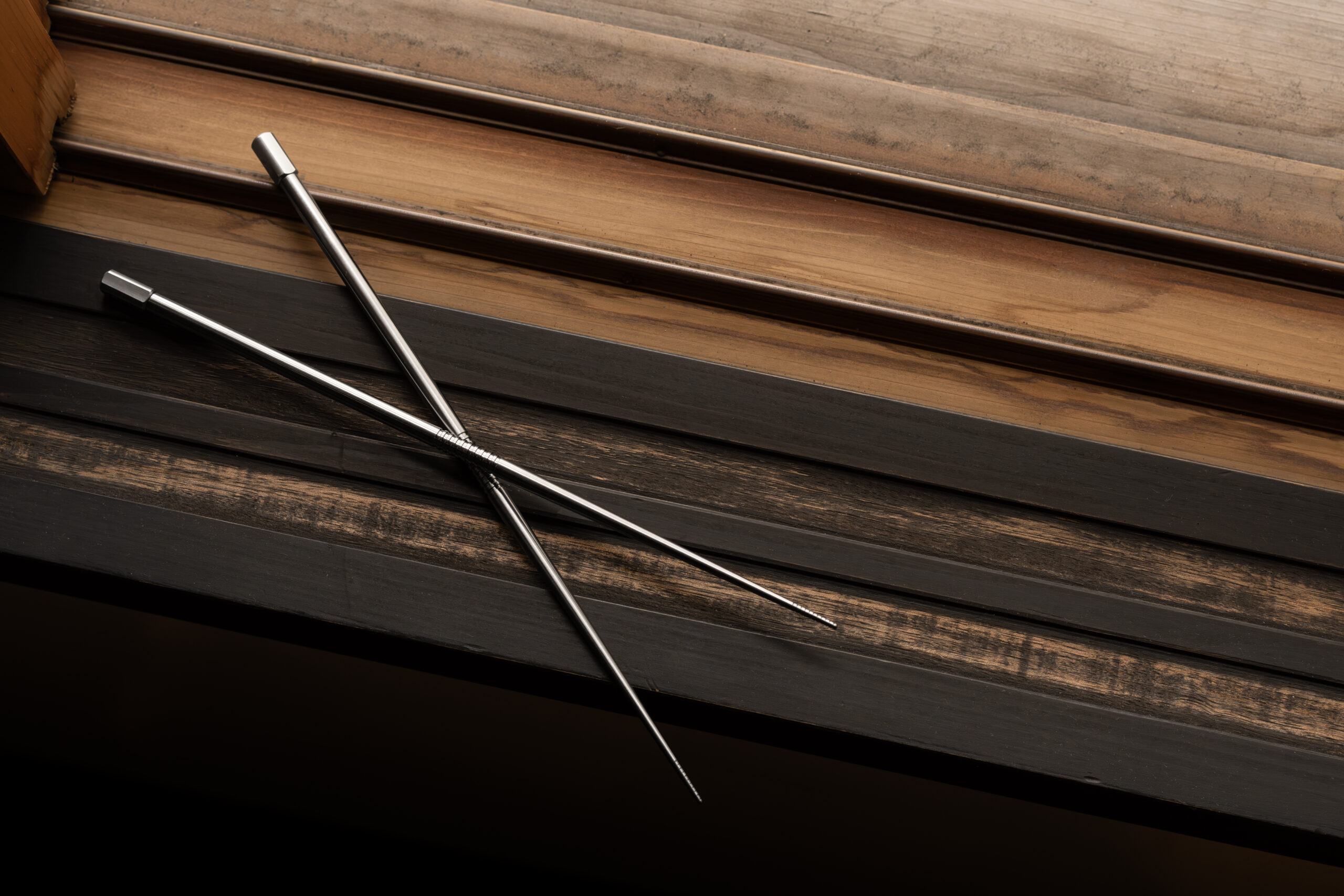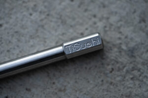 Modern day, state of the art, sushi sticks machined by us from certified medical and food grade 6AL4V titanium. Our titanium sushi sticks are unique in that we were the first company to build sticks that unscrew in the middle allowing them to be stored in our heavy duty, squadron cloth 1000D/500D laminate carrying case that is smaller than 1/2 the size of a modern smart phone (and far lighter).